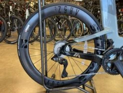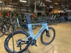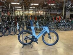 Our most popular triathlon frame decked out with a Shimano electronic groupset, Reynolds carbon wheels, and hydraulic disc brakes. World championship-winning aero efficiency.
