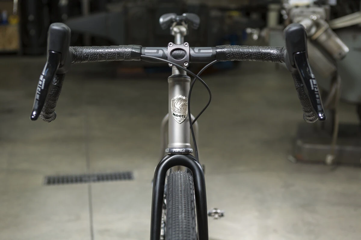 The ROUTT 45 is packed with multiple performance-oriented features. Perfect rear wheel and brake alignment come courtesy of our proprietary 6/4 titanium 3D-printed flat-mount disc mount. To provide the greatest range of tire and wheel combination compatibility, the frame and fork are designed to accommodate up to 50mm tires with a geometry optimized for 700c wheels. Standard builds come equipped with Moots full-carbon gravel/cross forks that conveniently feature hidden fender eyelets for foul weather riding and training.