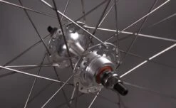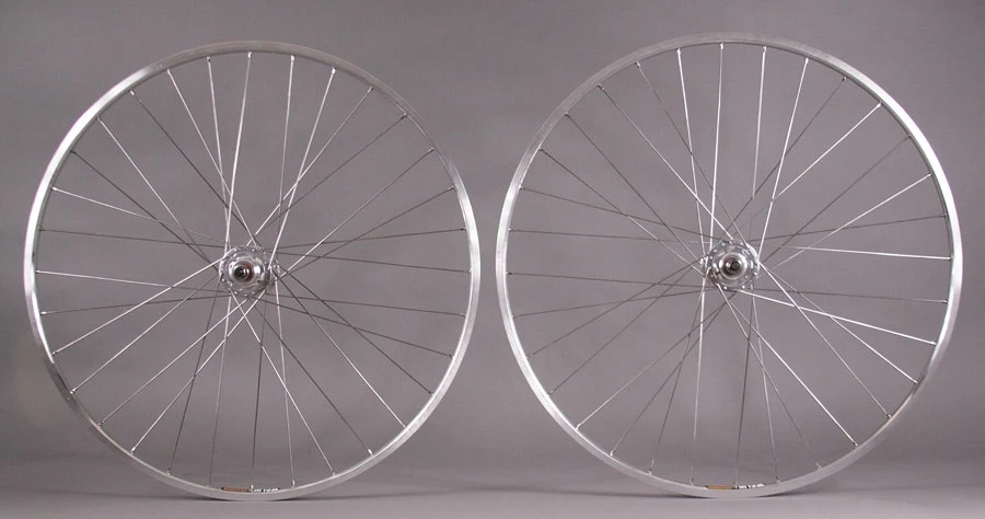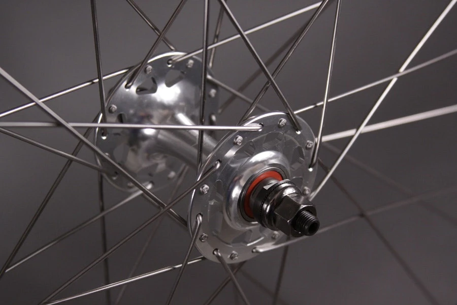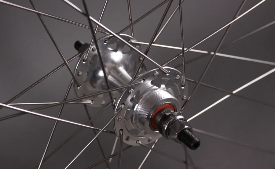 New Sun M13 polished silver 700c clincher rims – 32 DT spokes – smooth rolling Origin 8 branded Formula High flange fixed/free hubs.