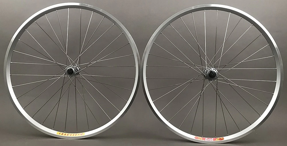 New Velocity Silver Dyad 32 Hole Rims – 18.6mm Inner Width, 24mm outer width, shaped like their A23 rims but thicker all around. Machined braking surface.
