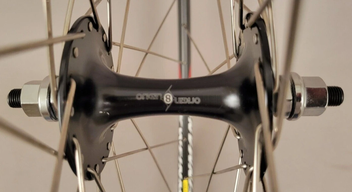 New Weinmann DP18 black rims with 36 spokes and Formula loose ball bearing hubs with Origin8 logo